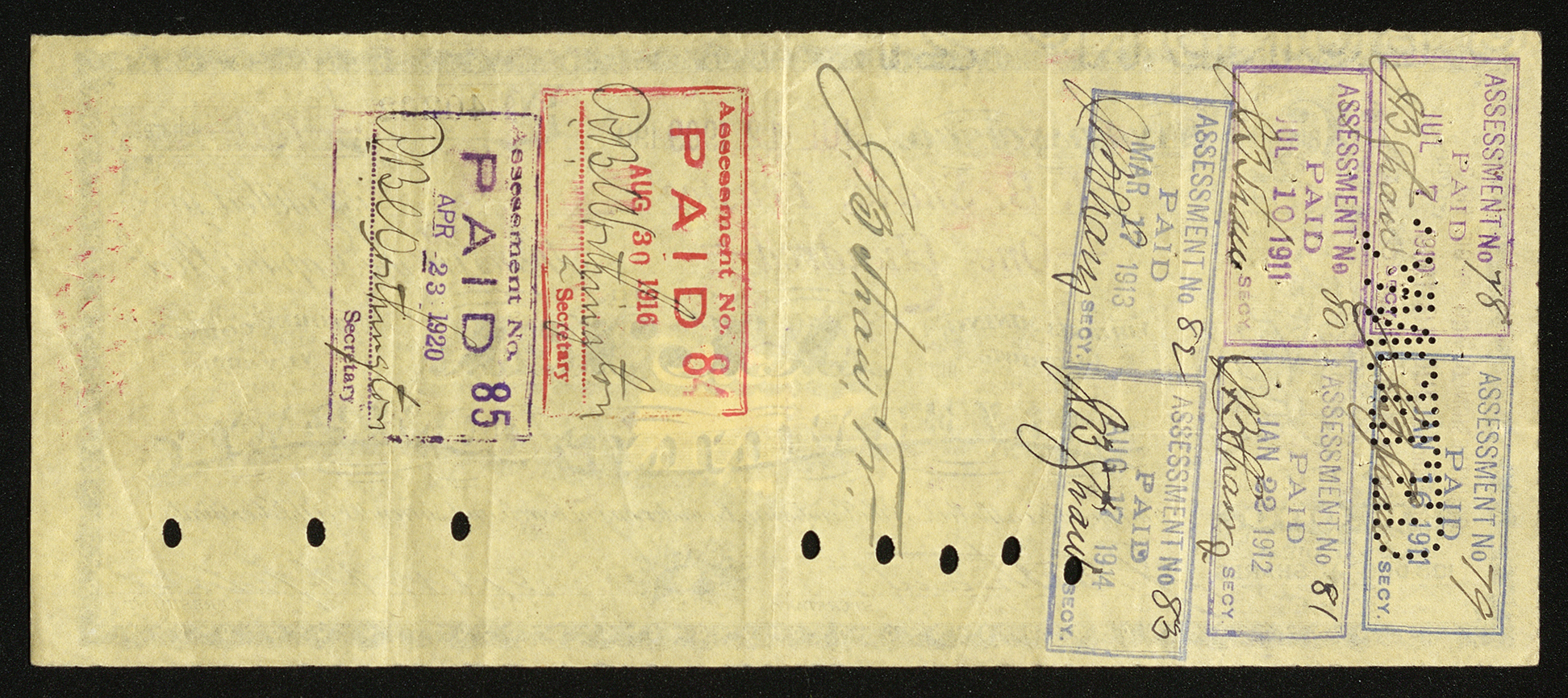The Alta Silver Mining Company stock certificate reads: Incorporated May 14th 1872 Capital 216,000 Dollars | 108,000 Shares | $2.00 Each No. 40262 | 100 Shares Virginia Mining District, Story County, Nevada San Francisco, Jul 12 1909 This Certifies that J. B. Shaw, Trustee is entitled to One Hundred Shares in the Capital Stock of the Alta Silver Mining Company. Transferable on the books of the Company, by endorsement hereon and surrender of this Certificate. Signed by the Secretary J. B. Shaw Signed by the President (illegible) Countersigned and Registered San Francisco Jul 13 1909 Registration Trust Company Signed by the Assistant Secretary (illegible) On the backside of this stock certificate are 8 stamps, 1 red, 3 purple, and 4 blue, denoting when dividends were paid. They are numbered 79 - 85, and are almost identical, except their date and number change, as well as the signature on the most recent stamps. The stamps state: Assessment No 78 Paid Jul 7 1910 J. B. Shaw, Secretary Assessment No 79 Paid Jan 16 1911 J. B. Shaw, Secretary Assessment No 80 Paid Jul 10 1911 J. B. Shaw, Secretary Assessment No 81 Paid Jan 22 1912 J. B. Shaw, Secretary Assessment No 82 Paid Mar 17 1913 J. B. Shaw, Secretary Assessment No 83 Paid Aug 17 1914 J. B. Shaw, Secretary Assessment No 84 Paid Aug 30 1916 R. B. Worthington, Secretary Assessment No 85 Paid April 23 1920 R. B. Worthington, Secretary In between assessment stamps 82/83 and 84 is the signature J. B. Shaw, Tr.