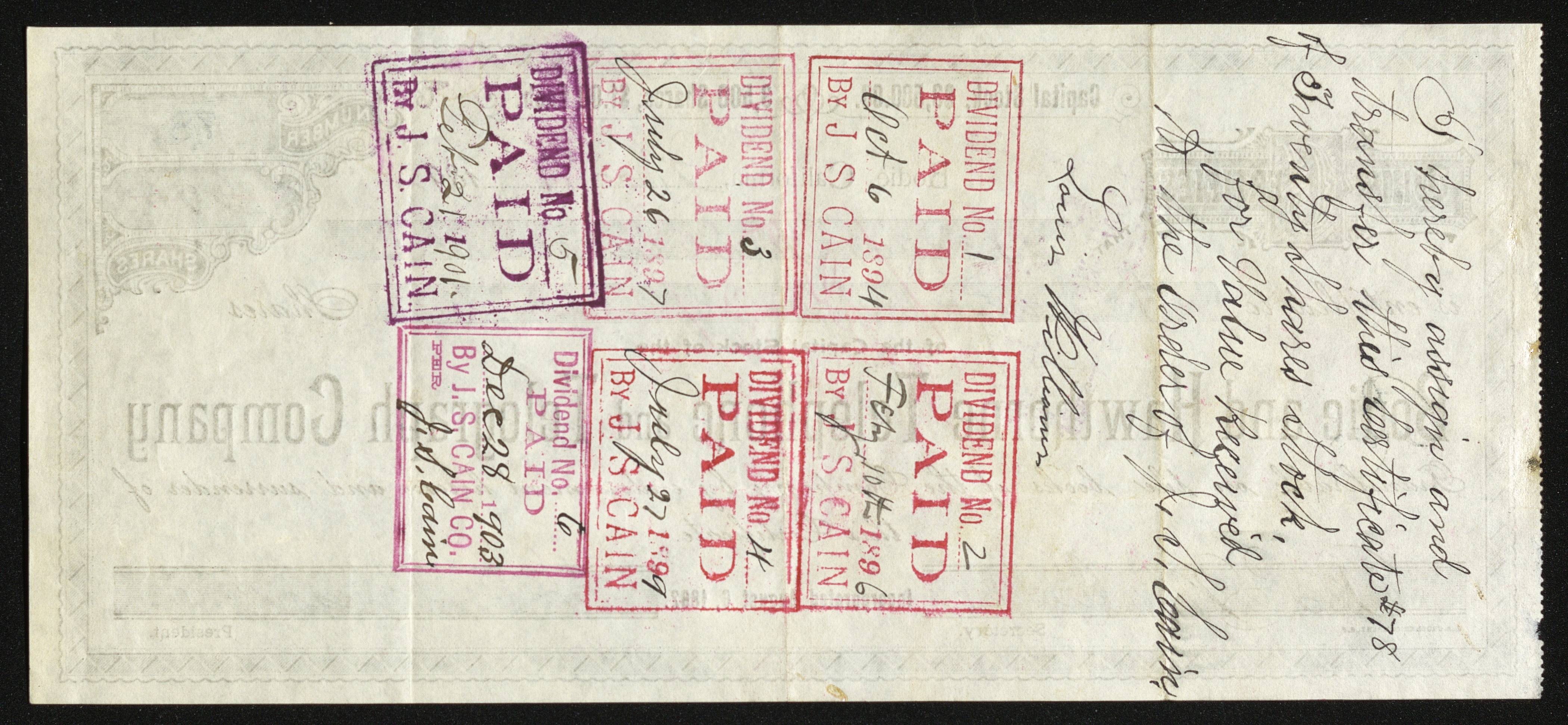 There are also 6 dividend stamps on the back made out to the order of J. S. Cain. that say