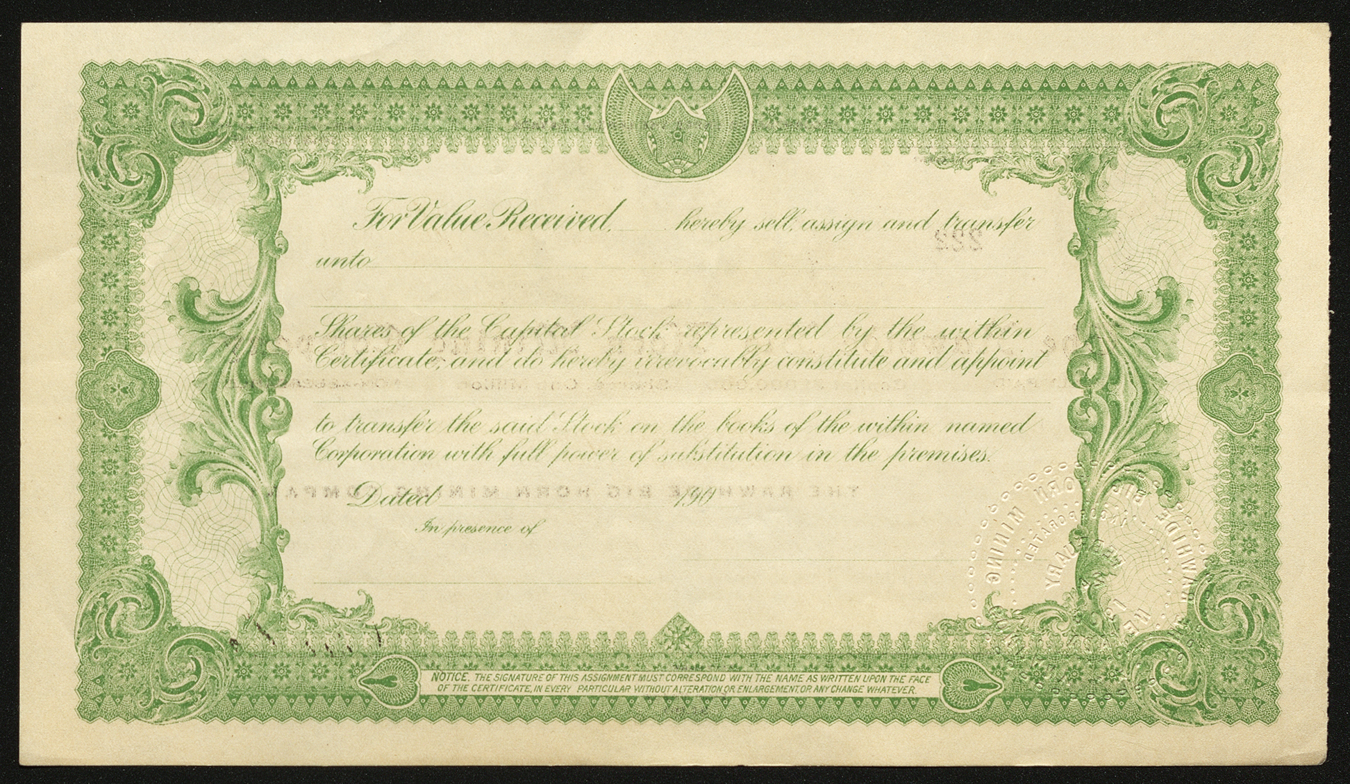 The Rawhide Big Horn Mining Company stock certificate reads: Incorporated under the Laws of Nevada. Principal Place of Business, Goldfield, Nevada No 221 | 100 Shares The Rawhide Big Horn Mining Company Fully Paid | Capital $1,000,000 | Shares, One Million | Non-Assessable This certifies that J. J. Bamberger is the owner of One Hundred Shares of the Capital Stock of The Rawhide Big Horn Mining Company transferable only on the books of the Corporation by the holder hereof in person or by Attorney, upon surrender of this Certificate properly endorsed. In Witness Whereof, the said Corporation has caused this Certificate to be signed by its duly authorized officers and to be sealed with the Seal of the Corporation this 9th day of April A.D. 1908. Signed by the Secretary G. R. Waterman Signed by the President B. Kendall The back of this certificate reads: For Value Received, ___ hereby sell, assign and transfer unto _____ Shares of the Capital Stock represented by the within Certificate, and do hereby irrevocably constitute and appoint _______ to transfer the said Stock on the books of the within named Corporation with full power of substitution in the premises Dated _____ 190_ In Presence of ______ Notice. The signature of this assignment must correspond with the name as written upon the face of the Certificate, in every Particular without alteration or enlargement, or any change whatever.