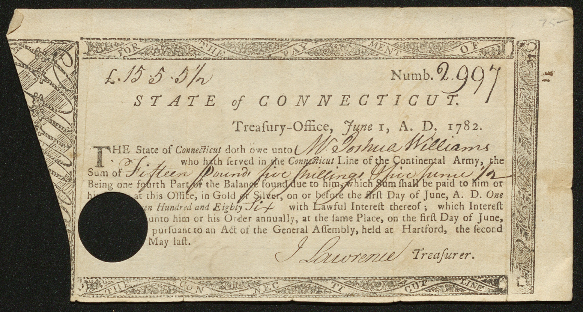 The State of Connecticut stock certificate reads: For the Payment of £.15.5.5 1/n. Number 2.997 State of Connecticut. Treasury-Office, June 1, A.D. 1782 The State of Connecticut doth owe unto W. Joshua Williams sum of Fifteen pounds, five shillings, five pence 1/n. Being one fourth Part of the Balance found due to him, which Sum shall be paid to him or his — at this Office, in Gold or Silver, on or before the first Day of June, A.D. One — —ven Hundred And Eighty Six with Lawful Interest thereof; which Interest — unto him or his Order annually, at the same Place, on the first Day of June, — pursuant to an Act of the General Assembly, held at Hartford, the second — May last. Signed by the Treasurer J. Lawrence On the backside of this document are several notes made by the treasurer when the owner collected interest: Interest paid to 1st June 1783 - J Lawrence Treas. Interest paid to 1 June 1784 - Rich Butler T’S Interest paid to 1 June 1785 - R Butler T’S Int paid to 1 January ‘86 - N. Z T’S Int paid to 1 February - R. Butler T’S In’ paid to 1 February 1788 - R. Butler T’S Int paid to 1 July 1789 - No Signature