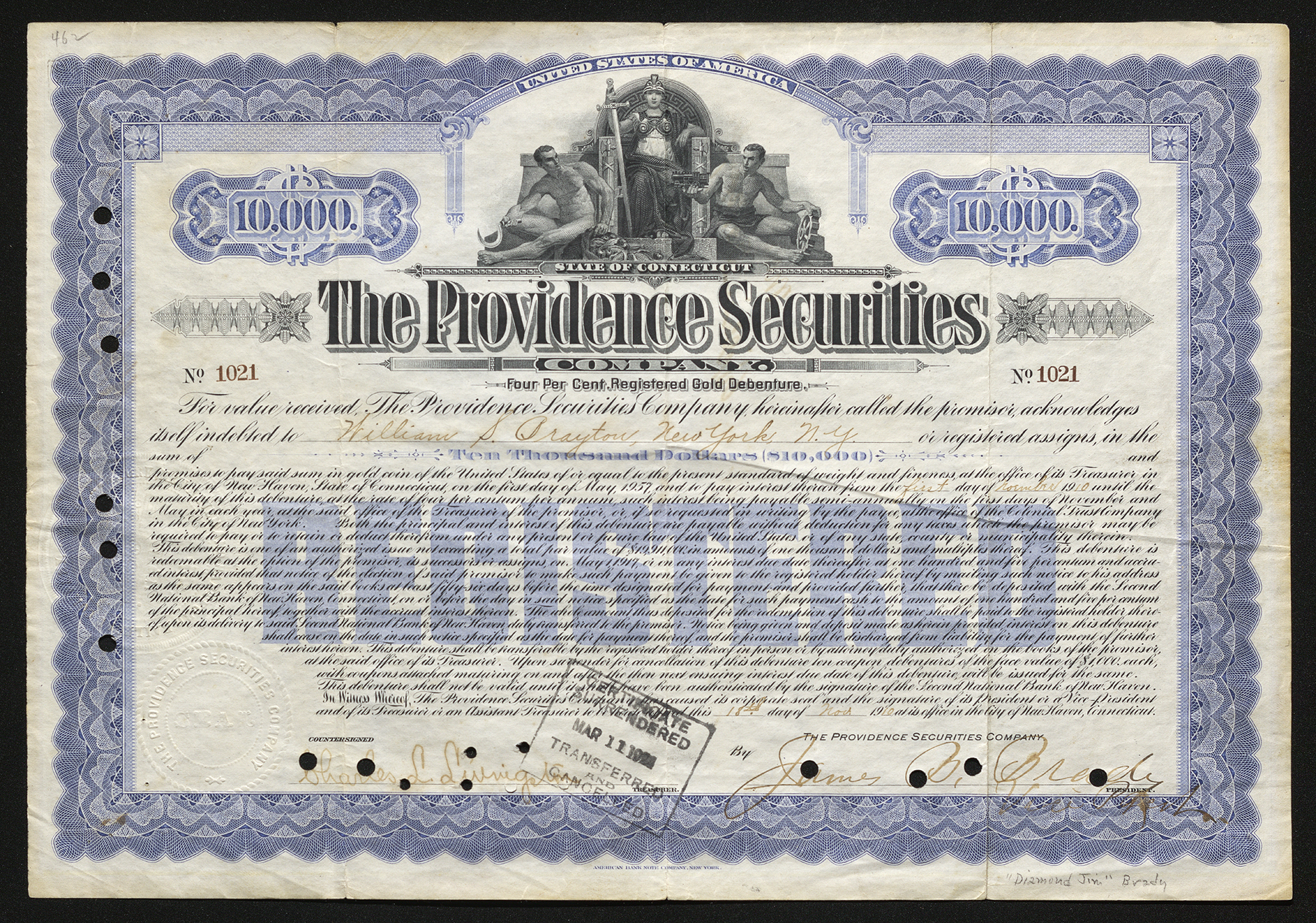 The Providence Securities Company stock certificate reads: No 1021 | $10,000 State of Connecticut The Providence Securities Company Four Per Cent. Registered Gold Debenture For value received, The Providence Securities Company, hereinafter called the promisor, acknowledges itself indebted to William S. Brayton, New York, N.Y. or registered assigns, in the sum of Ten Thousand Dollars ($10,000) and promises to pay said sum in gold coin of the United States of or equal to the present standard of weight and fineness, at the office of its Treasurer in the City of New Haven, State of Connecticut, on the first day of May, 1957, and to pay interest thereon from the first day of November 1910 until the maturity of this debenture, at the rate of four per centum per annum, such interest being payable semi-annually on the first days of November and May in each year at the said office of the Treasurer of the promisor, or, if so requested in writing by the payee, at the office of the Colonial Trust Company in the City of New York. Both the principal and interest of this debenture are payable without deduction for any taxes which the promisor may be required to pay or to retain or deduct therefrom under any present or future law of the united States or any state, county or municipality therein. This debenture is redeemable at the option of the promisor, its successors or assigns, on May 1, 1917, or on any interest due date thereafter at one hundred and five per centum and accrued interest, provided that notice of the election of said promisor to make such payment be given to the registered holder thereof by mailing such notice to his address as the same appears on the said books at least fifty-six days before the time designated for payment; and provided further, that there be deposited with the Second National Bank of New Haven, Connecticut, on or before the day in said noticed specified as the date for such payment cast to the amount of one hundred and five per centum of the principal hereof, together with the accrued interest thereon. The whole amount thus deposited for the redemption of this debenture shall be paid to the registered holder thereof, upon its delivery to said Second National Bank of New Haven duly transferred to the promisor. Notice being given and deposit made as herein provided, interest on this debenture shall cease on the date in such notice specified as the date for payment thereof, and the promisor shall be discharged from liability for the payment of further interest hereon. This debenture shall be transferable by the registered holder thereof in person or by attorney duly authorized on the books of the promisor, at the said office of its Treasurer. Upon surrender for cancellation of this debenture ten coupon debentures of the face value of $1,000. each, with coupons attached maturing on and after the then next ensuing interest due date of this debenture, will be issued for the same. This debenture shall not be valid until it shall have been authorized by the signature of the Second National Bank of New Haven. In Witness Whereof, The Providence Securities Company has caused its corporate seal and the signature of its President or a Vice-President and of its Treasurer or an Assistant Treasurer to be hereto offered this 18th day of Nov. 1910 at its office in the City of New Haven, Connecticut. The bottom of this certificate is countersigned by Charles L. Livington, who is denoted as the Treasurer, and signed by James D. Brady, who is denoted as the President On the bottom of the certificate, partially covering the signature of the countersigner, is a stamp in black ink that reads: a notice that reads: Surrendered Mar 11, 1914 Transferred and cancelled. On the back side of The Providence Securities Company stock certificate, there are four columns. From top-to-bottom, the columns read: This debenture is issued in lieu of or exchange for coupon debentures bearing the serial numbers 19862 to 19871 inclusive and coupon debentures bearing the same serial numbers will be issued in exchange for this debenture upon surrender and cancellation hereof. Coupon debentures bearing said serial numbers are not contemporaneously issued and outstanding. For a Valuable Consideration _______________ do hereby sell, assign and transfer to Bearen or assigns the within debenture of the Providence Securities Company with all moneys due, or to become due thereon, and do hereby irrevocably authorize said company to transfer the title to the same, accordingly on its books in the presence of Rob Murefs William S. Brayton. Dated March 10, 1914 *On the side of this document, in blue ink, are the letters aeaigiltings. This next column is in the form of a pamphlet, and from top-to-bottom reads: Number 1021. The Providence Securities Company. $10,000 per 4 cent. REGISTERED GOLD DEBENTURE. DUE MAY 1ST IN THE CITY OF NEW HAVEN, CONNECTICUT. OR THE CITY OF NEW YORK. Principal payable in the City of New Haven, Connecticut. Trustees certificate. This debenture is one of the series of debentures described in the within instrument the Second National Bank of New Haven. *Following the previous text, this column then specifies the registrar as The Second National Bank of New Haven, and is then signed by (illegible), who is denoted as the cashier. In case of any default in the punctual payment of the principal or of the interest of the within debenture, according to its tenor and effect. The New York, New Haven and Hartford Railroad Company, for value received, agrees to pay the same on demand. Dated New Haven, Connecticut, this 18th day of Nov A.D. 1910. The New York, New Haven and Hartford Railroad Company, Countersigned by the Treasurer (illegible) Signed by the Vice President (illegible) This stock certificate (No. 1021) represents the amount of $10,000 for The Providence Securities Company.