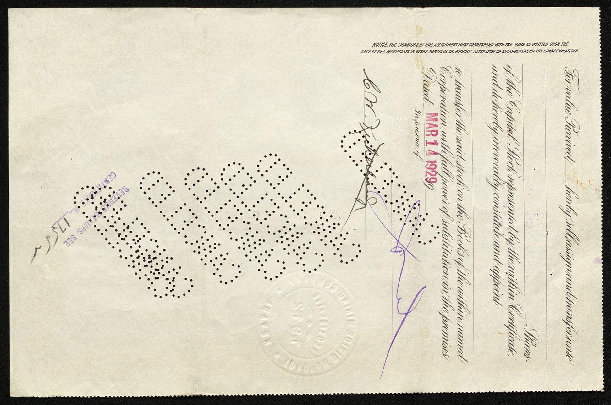 Backside shows various legal language including signatures and dates and cancel stamps punched out