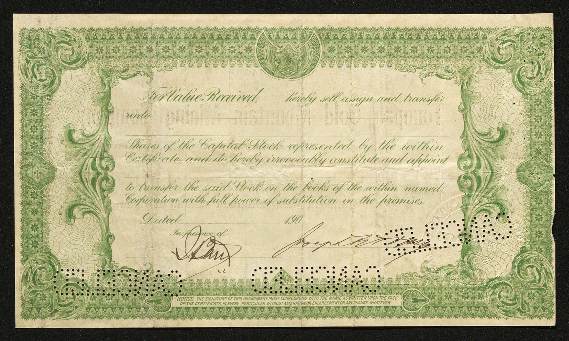 Tonopah Gold Mountain Mining Company stock certificate reads: Incorporated under the Laws of Arizona 1,000,000 shares, Capital $1,000,000, Non-assessable No 1182 | 100 Shares This Certifies That Joseph. R. Toplit. is the owner of One Hundred Shares of the Capital Stock of Tonopah Gold Mountain Mining Company transferable only on the books of the Corporation by the holder hereof in person or by Attorney, upon surrender of this Certificate properly endorsed. In Witness Whereof, the said Corporation has caused this Certificate to be signed by its duly authorized officers and to be sealed with the Seal of the Corporation this 18th day of September A.D. 1904 Signed by the Secretary (illegible) Signed by the President Key Pittman From the Press of John Partridge, S.F. On the back of this certificate is an ornate border and text, both written in green ink, which reads: For Value Received, ______ hereby sell, assign and transfer unto ___________ Shares of the Capital Stock represented by the within Certificate, and do hereby irrevocably constitute and appoints ___________ to transfer the said Stock on the books of the within named Corporation with full power of substitution in the premises Dated __________ 190_ In presence of Joseph R. Toplit — illegible Notice. The signature of this assignment must correspond with the name as written upon the face of the certificate, in every particular without alteration or enlargement, or any change whatever.