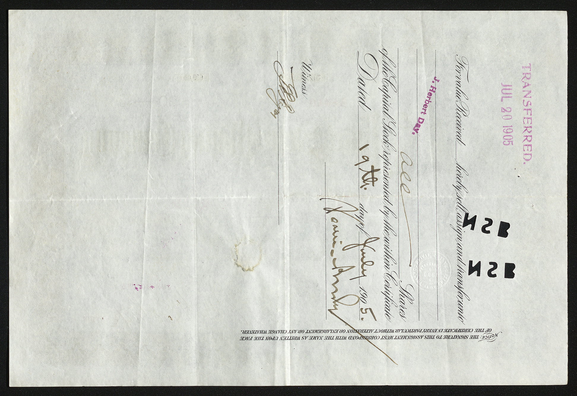 The United States Mining Company stock certificate reads: Capital Stock $15,000,000. | 600,000 Shares - $25 Each. Full Paid and Un-Assessable No. X8410 | 20 Shares United States Mining Company Incorporated under the Laws of the State of Maine This Certifies that Pearmain & Brooks is the owner of Twenty Shares of the Capital Stock of the United States Mining Company transferable by assignment in writing recorded in the books of the Corporation on surrender of this Certificate. Witness the Corporate Seal and signature of the President and Treasurer this Jun 30 1905 Signed and Attested by the Treasurer F. W. Batcheldi Signed and Att ested by the Vice President Wm H. Coolia Registered by The National Shawmut Bank of Boston, signed by the Assistant Cashier W. Graphy Transferred Jul 20 1905 The back side of this stock certificate states: For value Received ___ hereby sell, assign, and transfer unto J. Herbert Day. all Shares of the Capital Stock represented by the within Certificate. Dated Jul 19 1905 Signed by J. Herbert Day Witness G. M. Jones Signature Guaranteed. (illegible) Transferred Jul 20 1905 Notice: The signature to this assignment must correspond with the name as written upon the face of the certificate in every particular without alteration or enlargement or any change whatever.