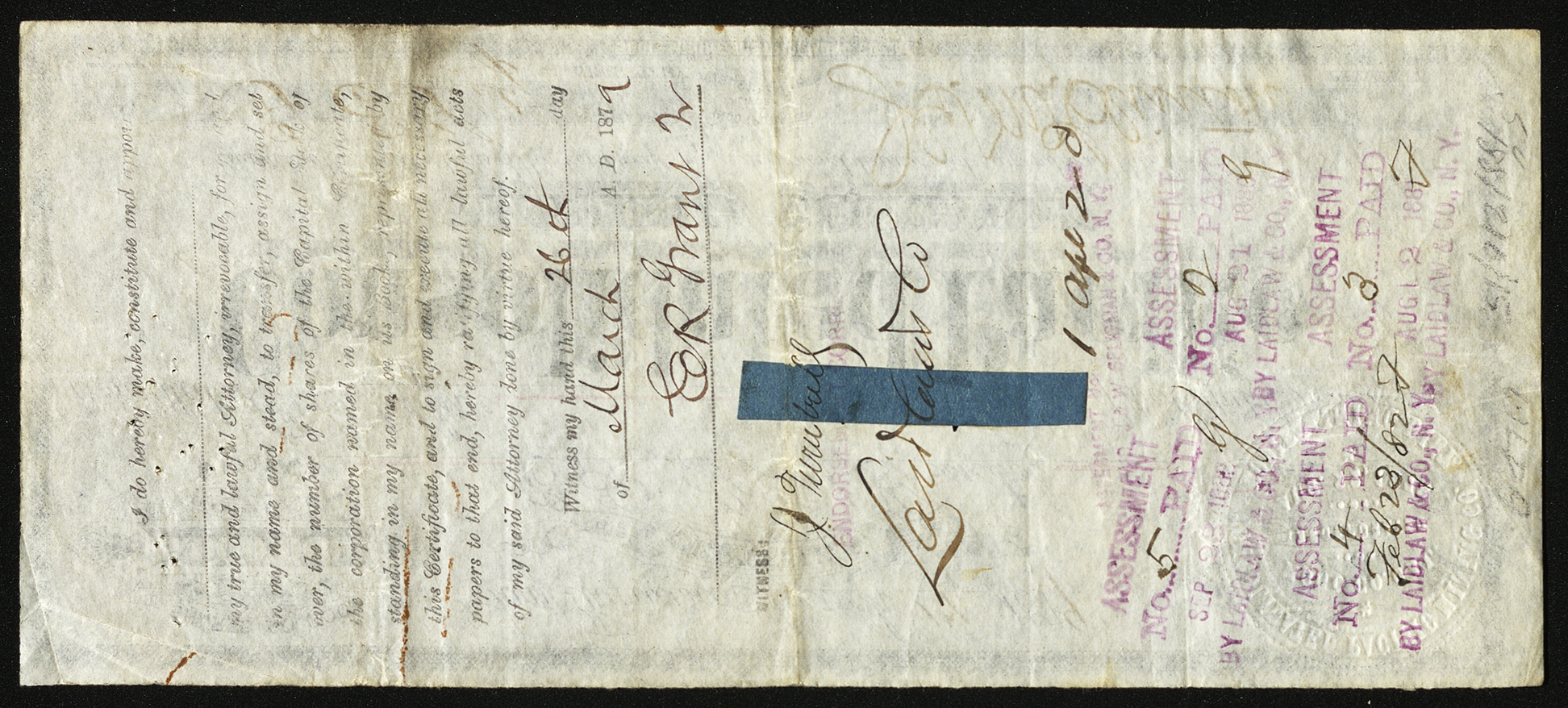The Consolidated Pacific Mining Company stock certificate reads: Shares 60.000 Capital 6.000.000 Dollars | $100 each No. 922 | 25 Shares San Francisco, March 17 1879 This Certifies that E. R. Grant, Trustee is entitled to Twenty five Shares of the Capital STock of the Consolidated Pacific Mining Company Transferable on the books of the Company, by endorsement hereon and surrender of this Certificate. Signed by the Secretary F. E. Luty Signed by the President G. M. Clinton Bodie Mining District. Mono. Co. Cal. The back of this certificate states: I do hereby make, constitute and appoints _____ my true and lawful Attorney, irrevocable, for — and in my name and stead, to transfer, assign, and set over, the number of shares of the Capital Stock Of the Corporation named in the within Certificate, standing in my name on its Books, represented by this Certificate, and to sign and execute all necessary papers to that end, hereby ratifying all lawful acts of my said Attorney done by virtue hereof. Witness my hand this 26th day of March A.D. 1879 Signed E. R. Grant Signed Witness illegible Laidlaw & Co. There are also several stamps that state when the assessments of this certificate were paid Assessment No. 1 Apl 2 — Assessment No. 2 Paid Aug 21 1880 By Laidlaw & Co., N.Y Assessment No. 3 Paid Aug 2 1881 By Laidlaw & Co., N.Y Assessment No. 4 Paid Feb 2 1882 By Laidlaw & Co., N.Y Assessment No. 5 Paid Sep 23 1882 By Laidlaw & Co., N.Y