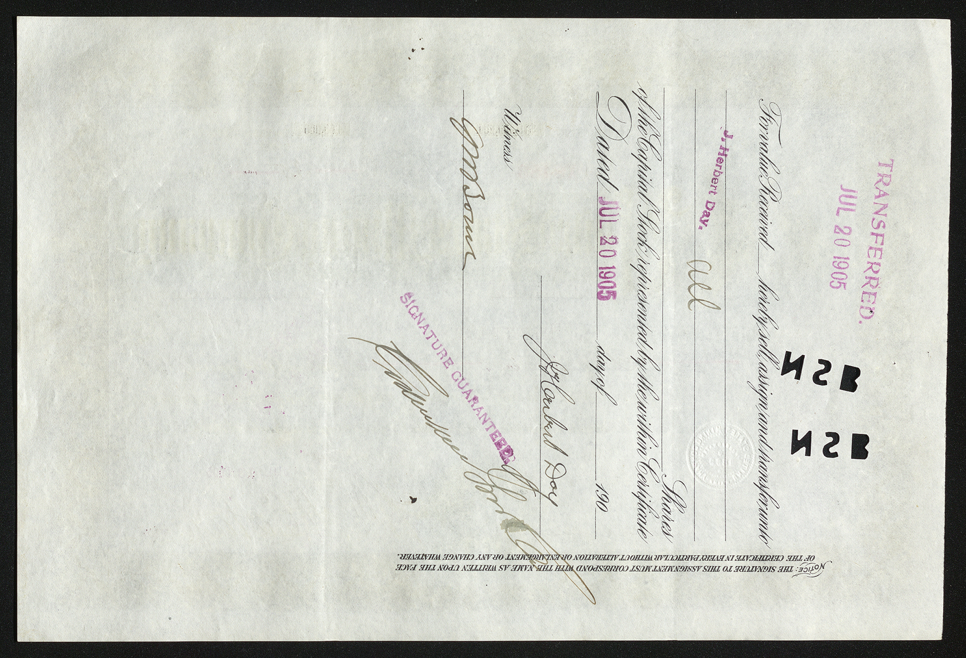The United States Mining Company stock certificate reads: Capital Stock $15,000,000. | 600,000 Shares - $25 Each. Full Paid and Un-Assessable No. X8483 | 35 Shares United States Mining Company Incorporated under the Laws of the State of Maine This Certifies that J. Herbert Day is the owner of Thirty five Shares of the Capital Stock of the United States Mining Company transferable by assignment in writing recorded in the books of the Corporation on surrender of this Certificate. Witness the Corporate Seal and signature of the President and Treasurer this July 13 1905 Signed and Attested by the Treasurer F. W. Batcheldi Signed and Att ested by the Vice President Wm H. Coolia Registered by The National Shawmut Bank of Boston, signed by the Assistant Cashier W. Graphy Transferred Jul 20 1905 The back side of this stock certificate states: For value Received ___ hereby sell, assign, and transfer unto J. Herbert Day. all Shares of the Capital Stock represented by the within Certificate. Dated Jul 20 1905 Signed by J. Herbert Day Witness G. M. Jones Signature Guaranteed. (illegible) Transferred Jul 20 1905 Notice: The signature to this assignment must correspond with the name as written upon the face of the certificate in every particular without alteration or enlargement or any change whatever.