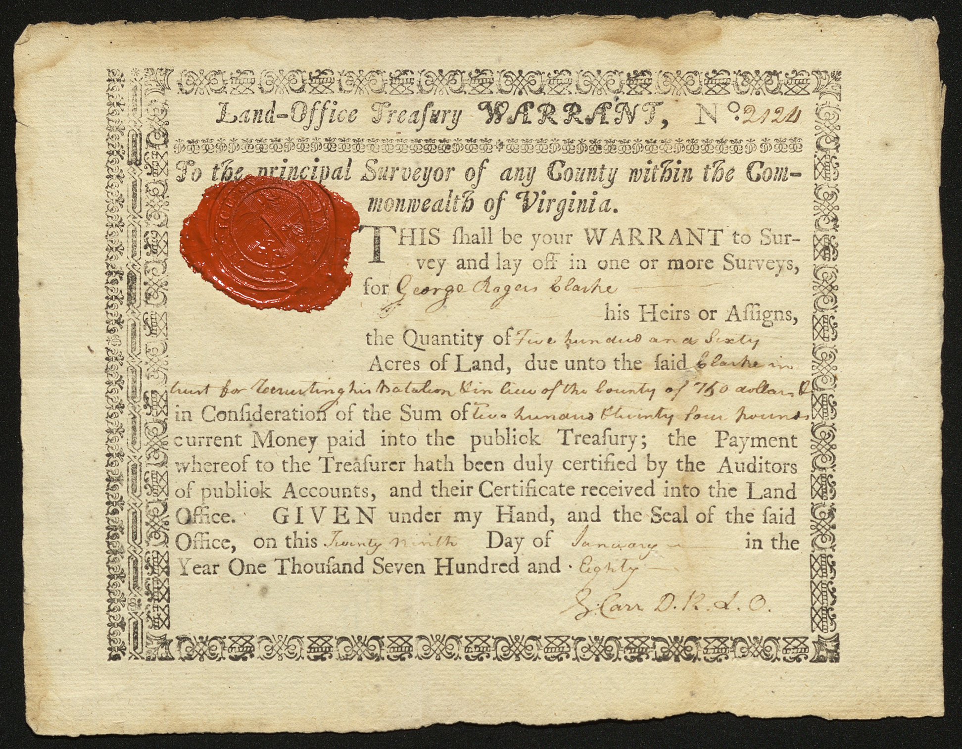 This shall be your WARRANT to Survey and lay off in one or more Surveys for George Rogers Clarke his Heirs or assigns, the Quantity of Five hundred and Sixty Acres of Land, due to the said Clarke in hunt for Recruiting his Batalion Sin him of the bounty of 750 (illegible) in Confideration of the Sum of Two hundred *illegible* four pounds current Money paid into the publick Treasury; the Payment whereof to the Treasurer hath been duly certified by the Auditors of publick Accounts, and their Certificate received into the Land Office. GIVEN under my Hand, and the Seal of the said Office, on this Twenty Ninth Day of January in the Year One Thousand Seven Hundred and Eighty
