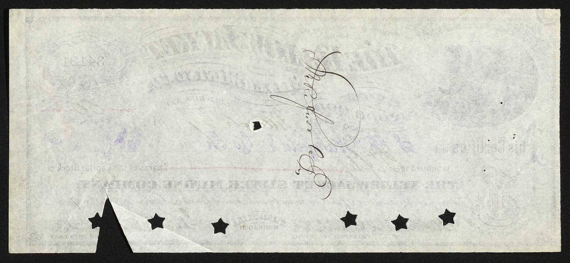 The Yellow Jacket Silver Mining Company stock certificate reads: